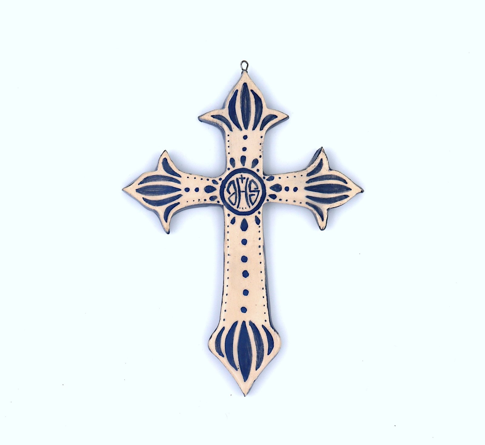 Croix en faïence blanche sculptée et décorée à la main.