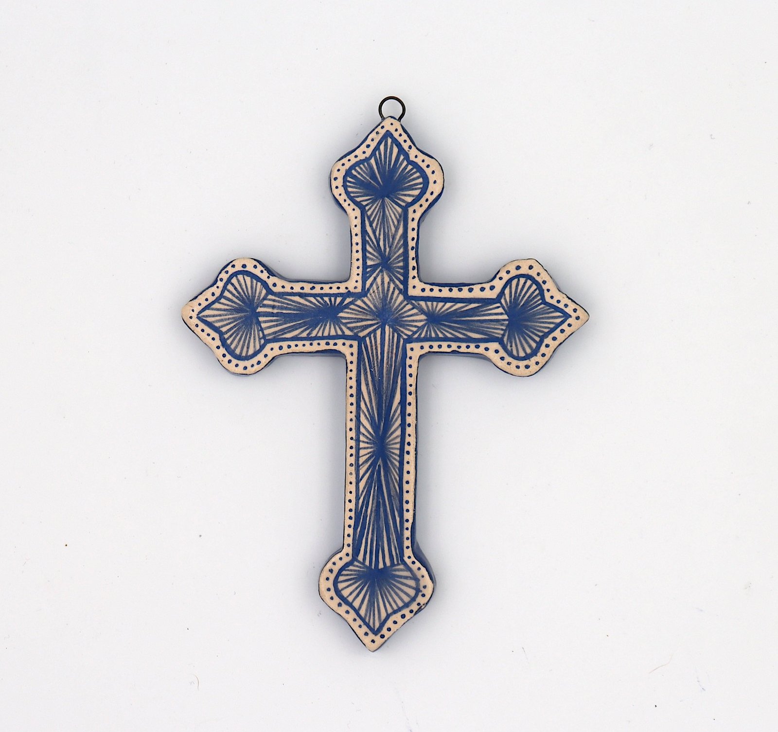 Croix en faïence blanche sculptée et décorée à la main.