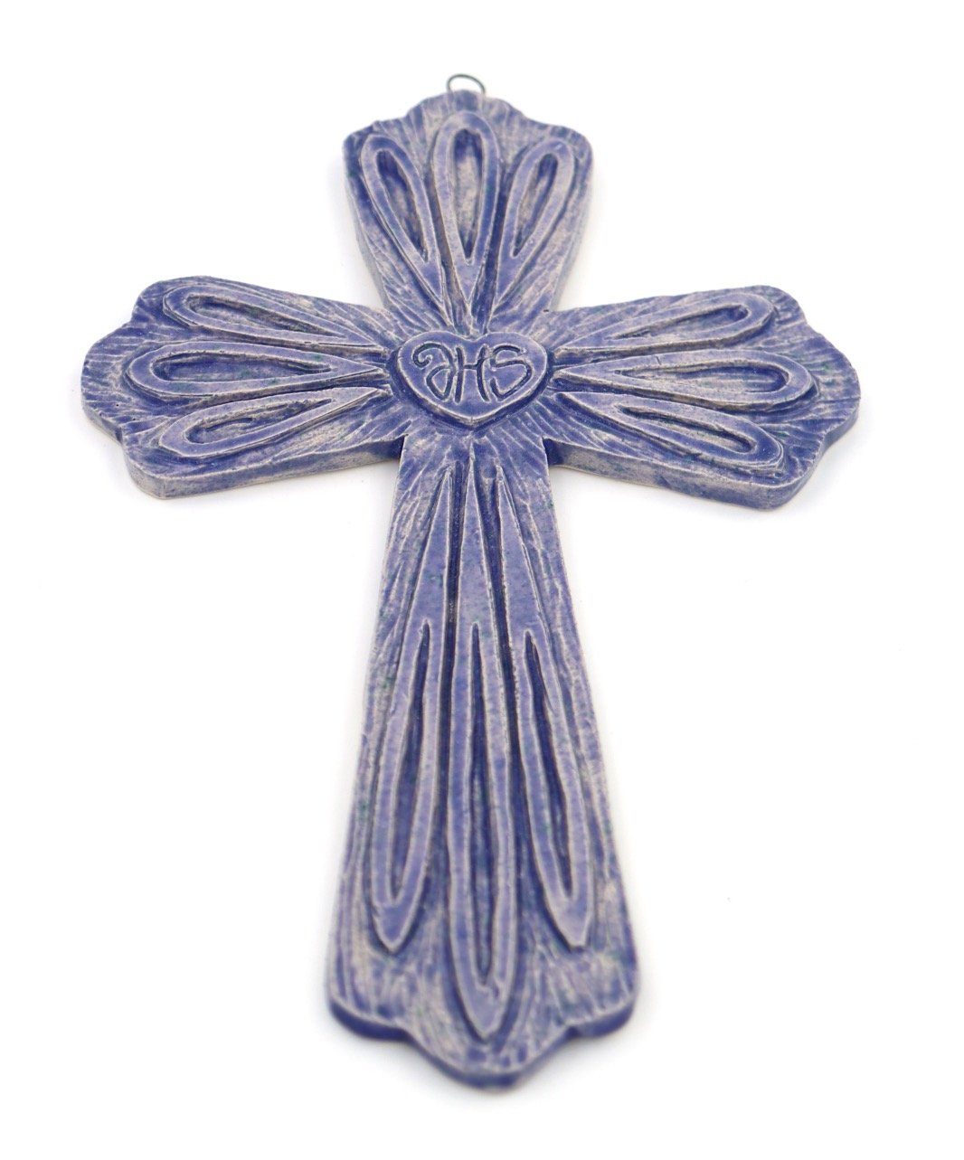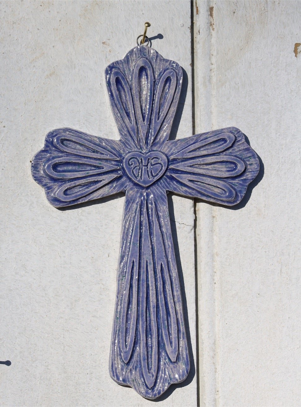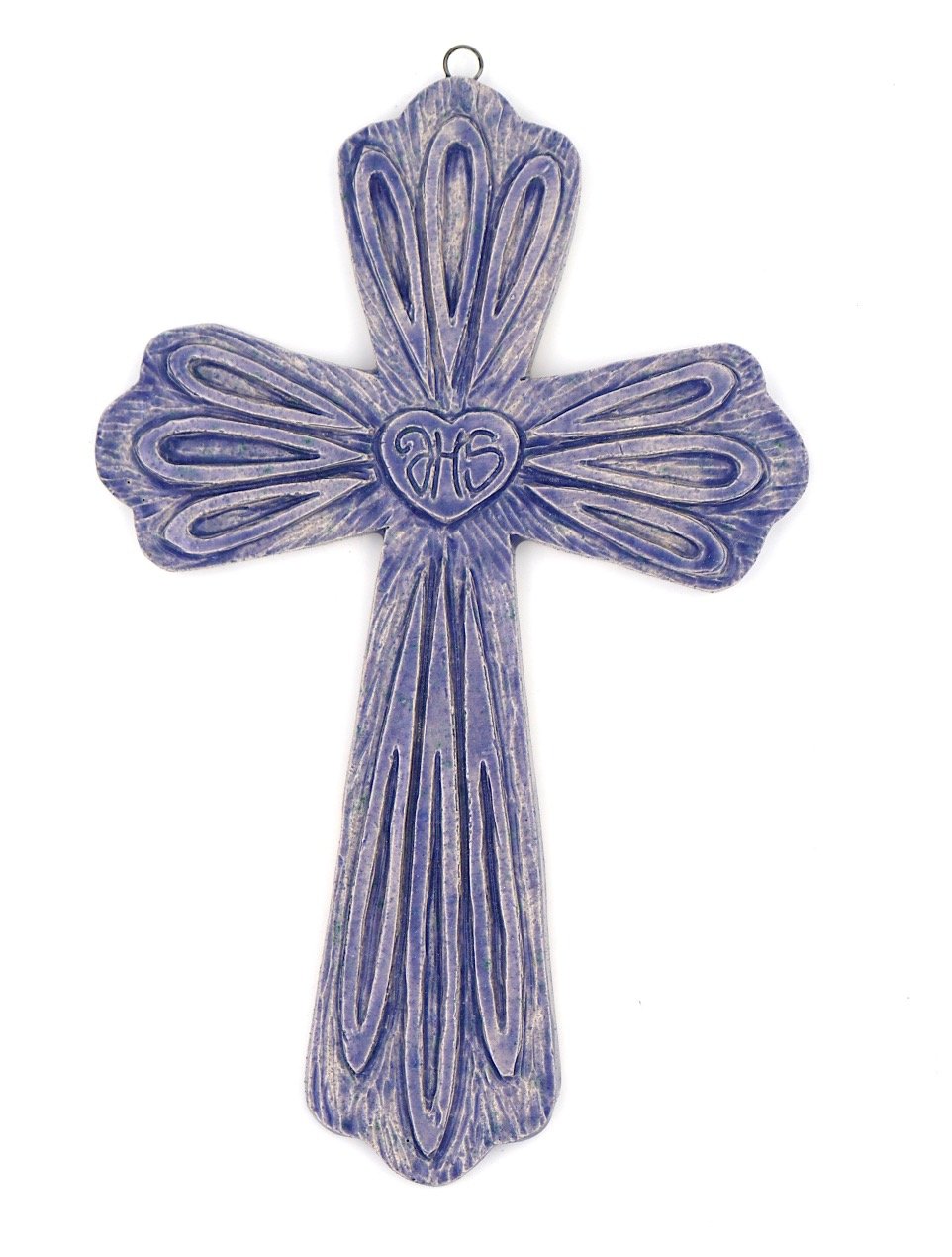 Croix en faïence blanche modelée et sculptée à la main.