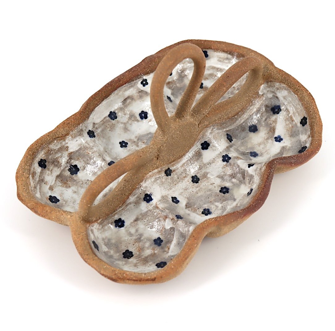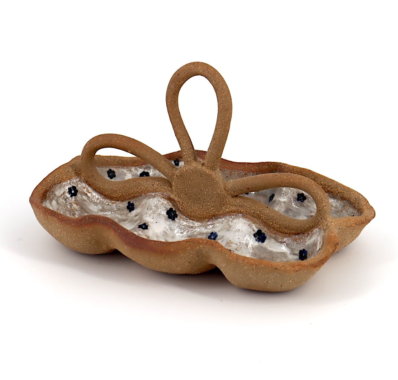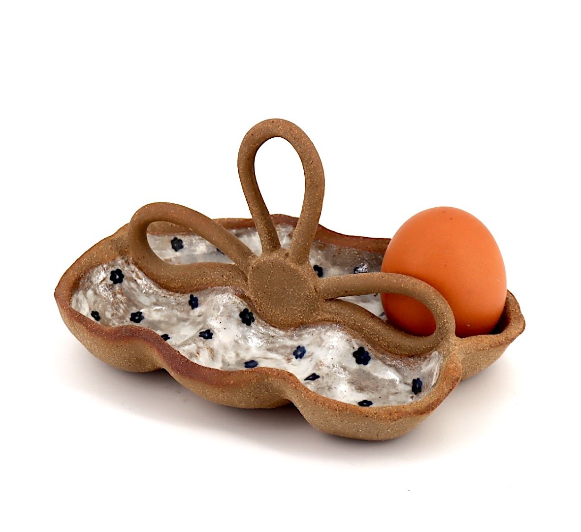 Porte oeufs en forme de panier pour 6 oeufs. Objet en grès, modelé et décoré à la main.
