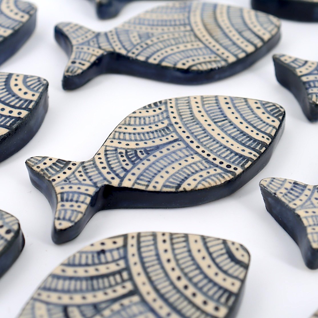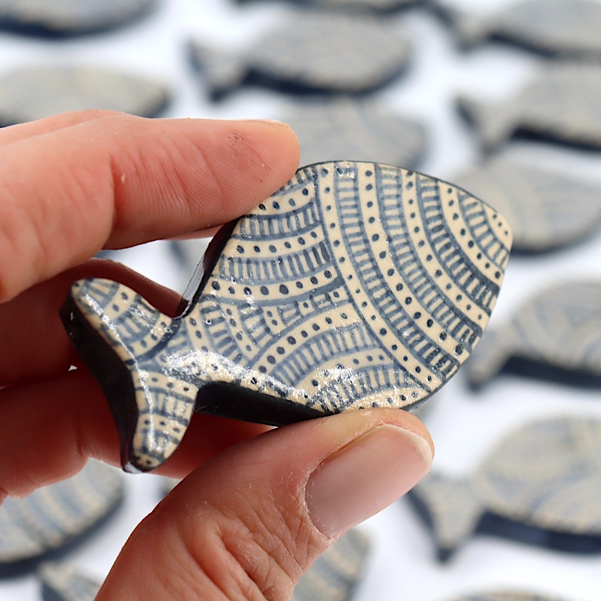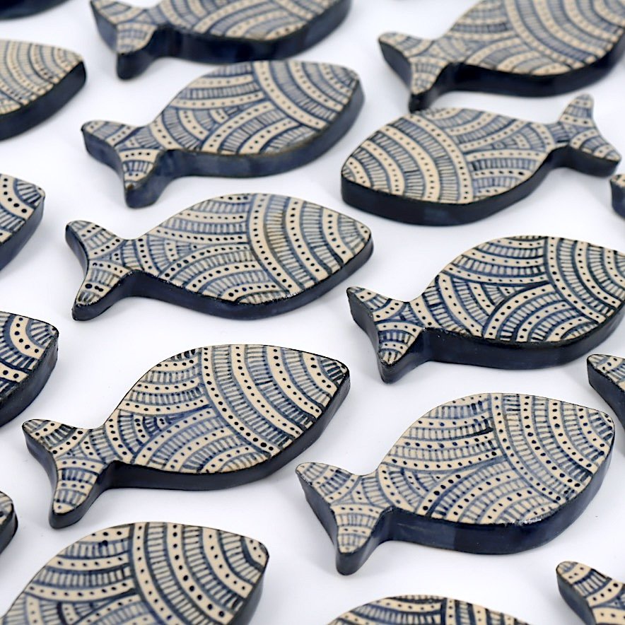Porte-couteaux en grès blanc modelés et décorés individuellement à la main. Chaque dessin est unique.